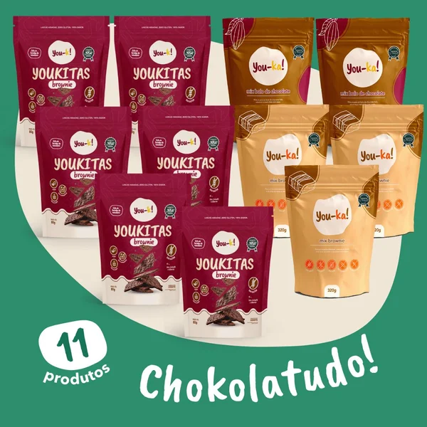 Todos os produtos são feitos com a exclusiva farinha panificável de mandioca You-k!, são 100% sem glúten, sem transgênicos e com ingredientes naturais, garantindo textura, sabor intenso de chocolate e muita praticidade no dia a dia.